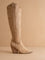 Classic cowboy embroidery on a suede cowboy boot that's been raised to the knees.